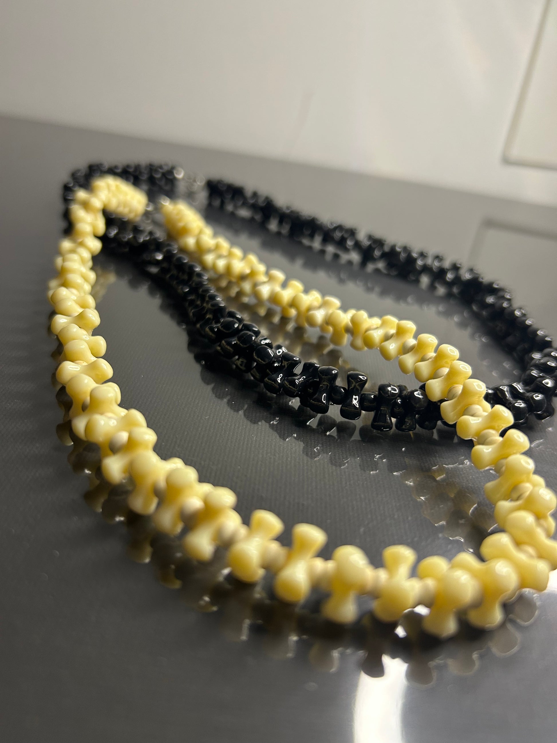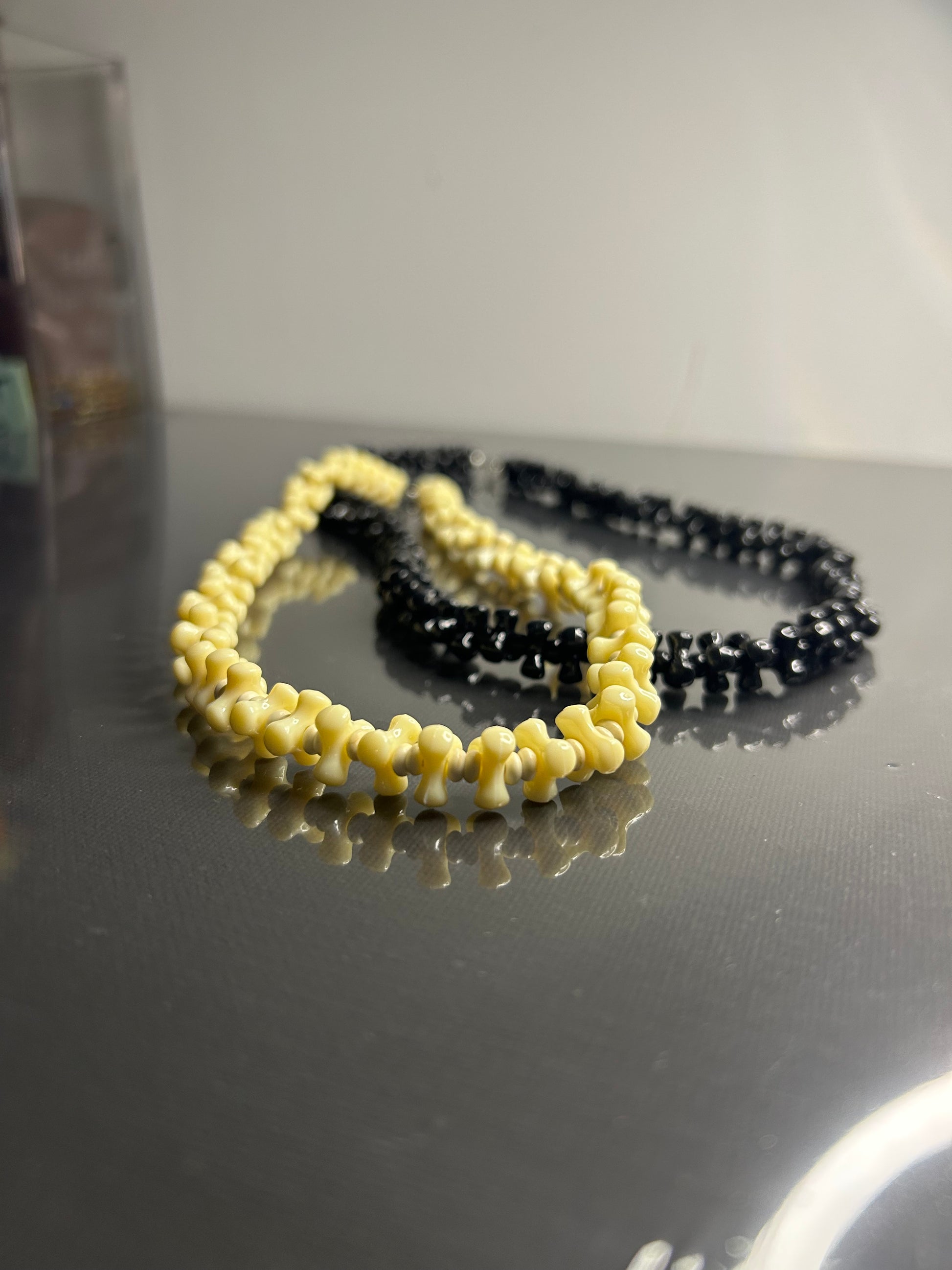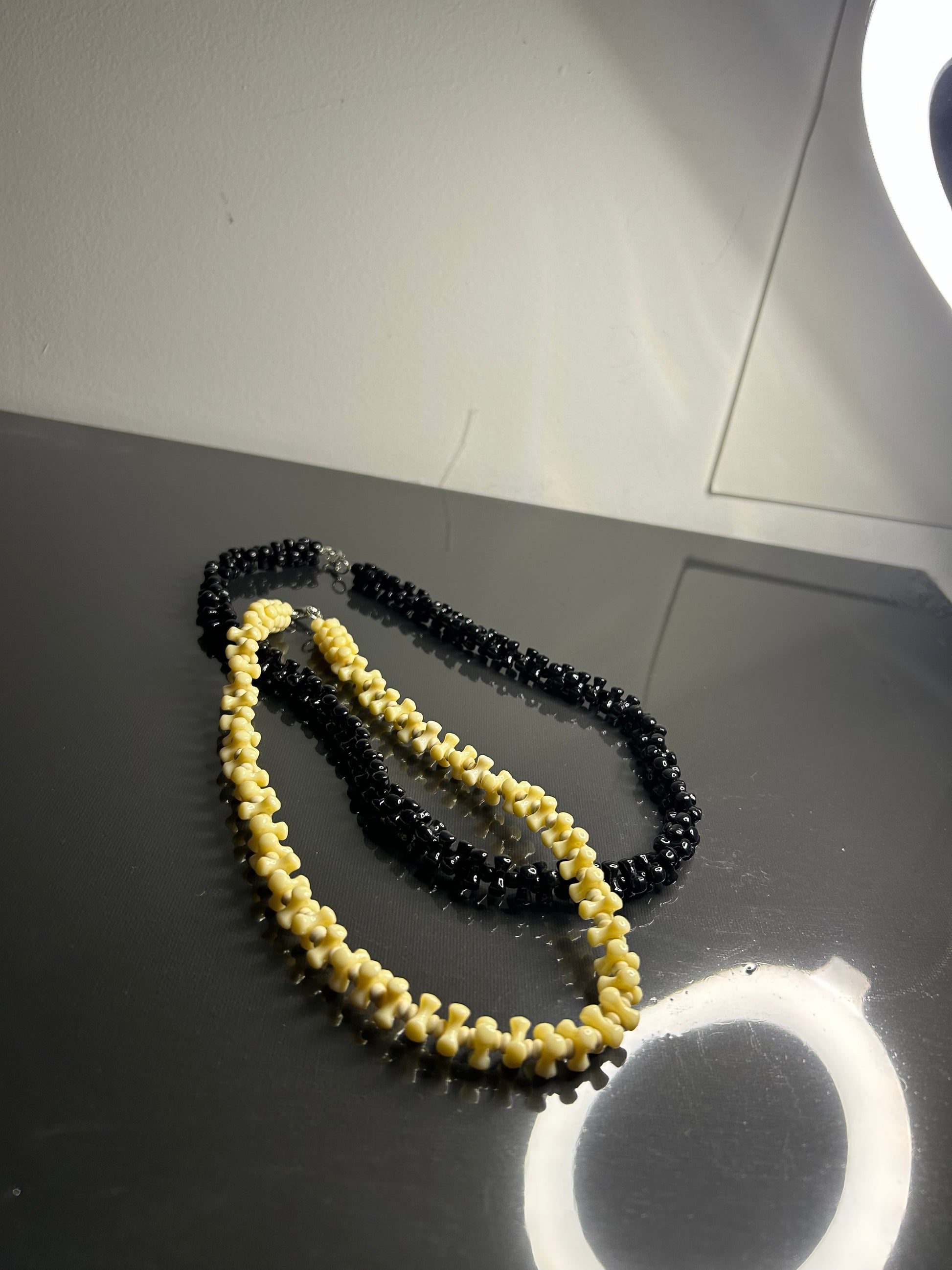 Necklace Details: Plastic beads with silver metal clamp. The beads are placed over a durable elastic string.