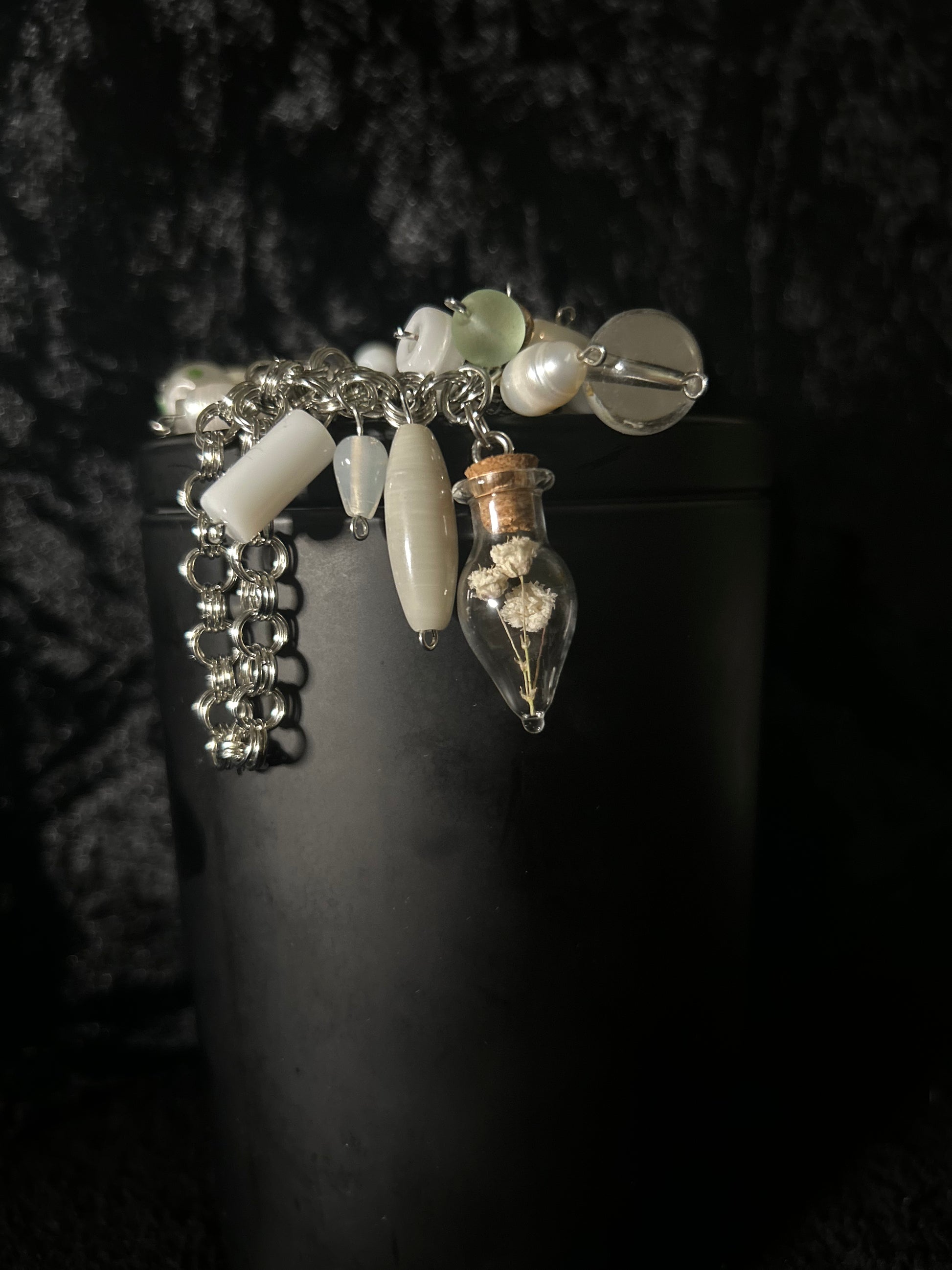 The silver chain is hand made. There are two glass vases, each with teal flowes inside. Real baby’s breath and Liatris flowers.