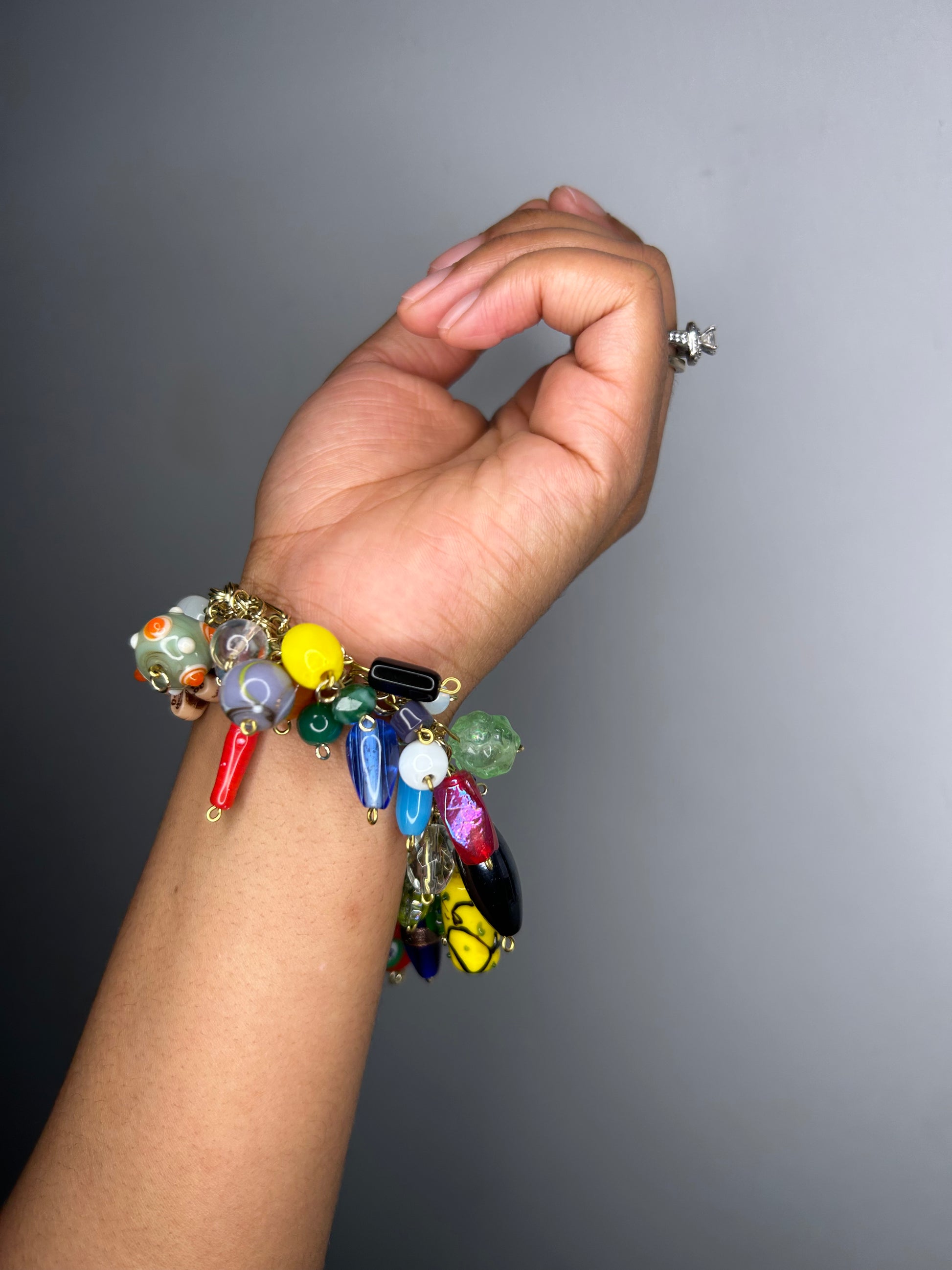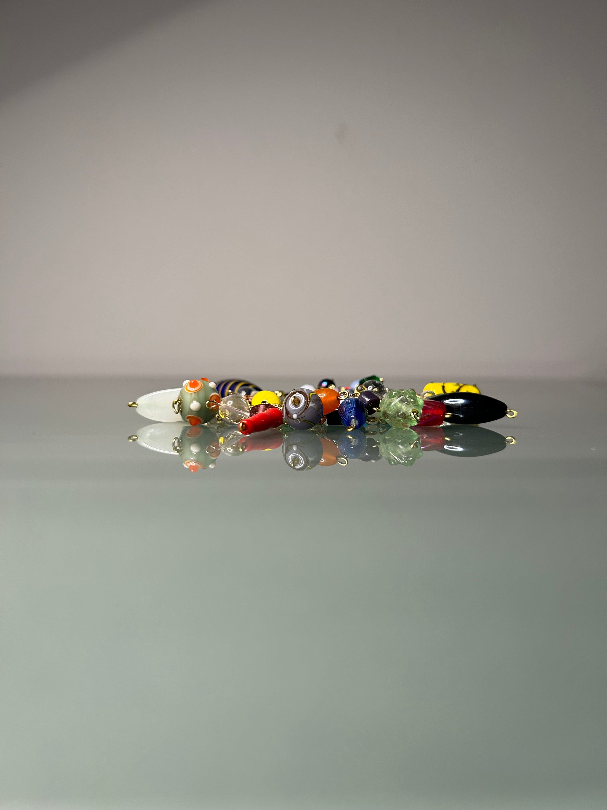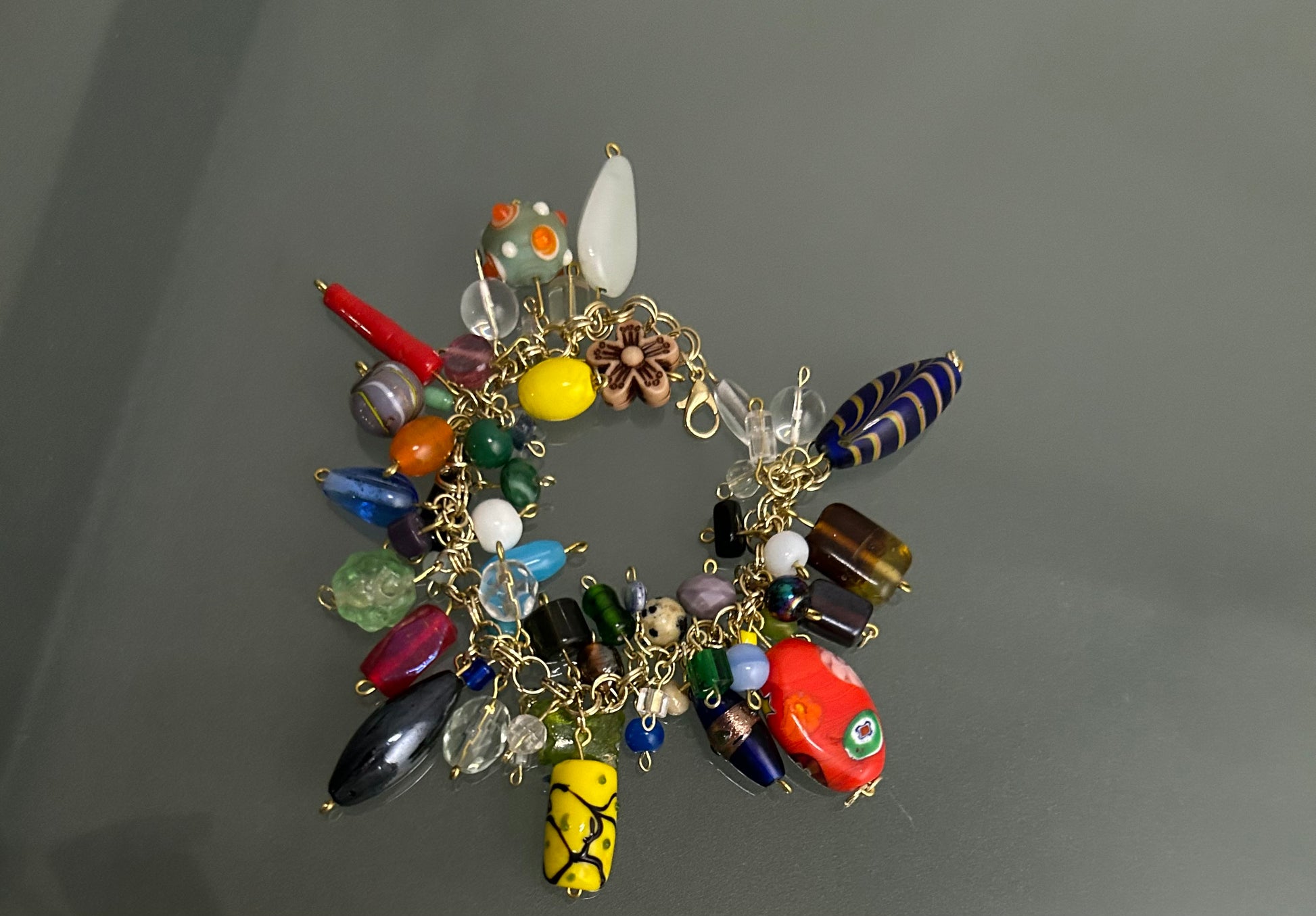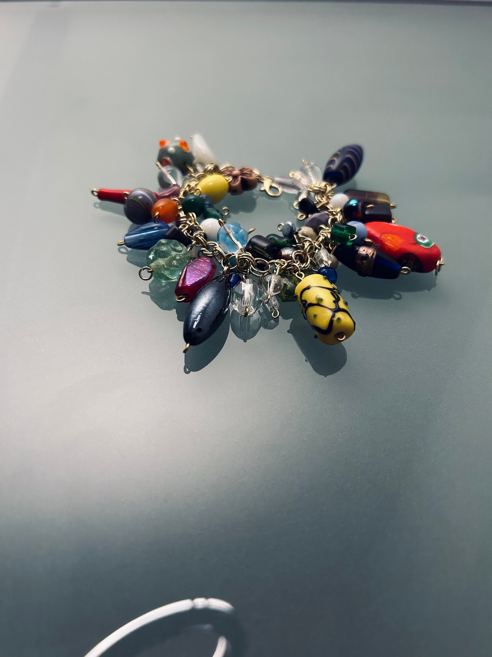 Material: Glass beads. Plastic beads. Gold Jump Rings. Gold Clasp.